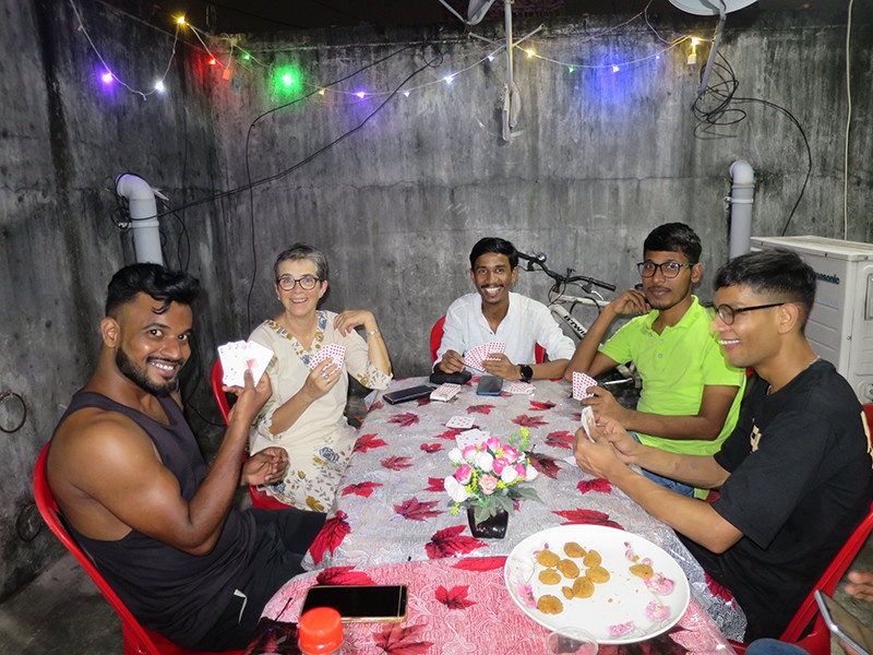 Bernard, un sympathisant de longue date et juste arrivé avec Fabienne pour sa première fois en Inde, était présent et a pu rencontrer une dizaine des garçons qui ont grandi dans les foyers. Une soirée bien sympathique entre jeux, discussions, cuisine et bonne humeur.