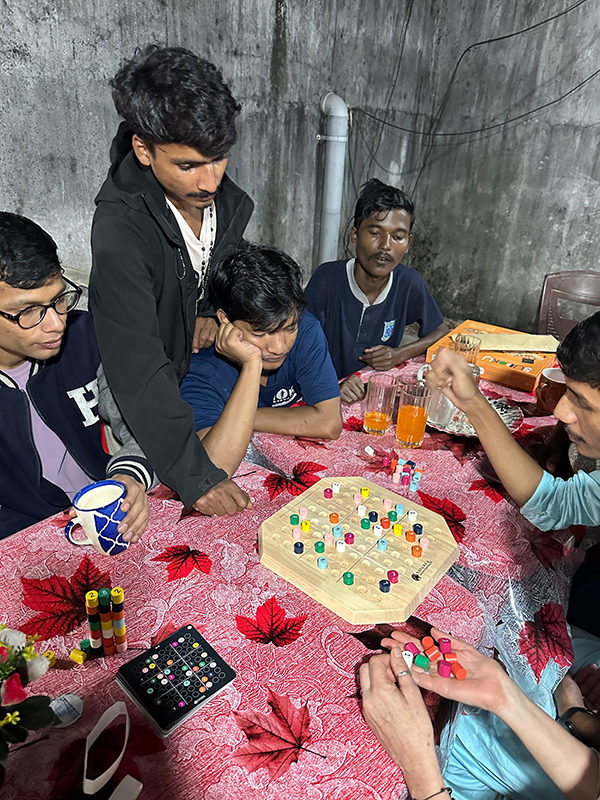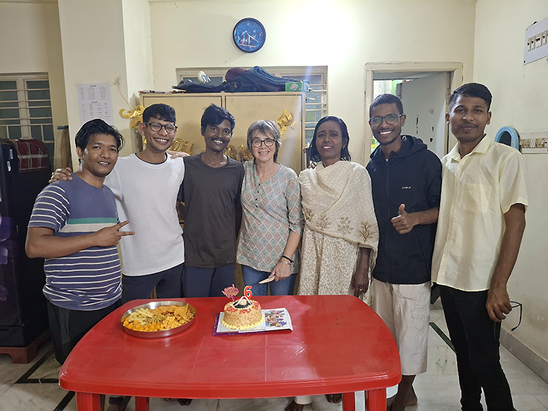 Debashis, Rabi, Sanatan, Fabienne, Saghir, Shamim et leur mère lors d'un anniversaire, mars 2025
