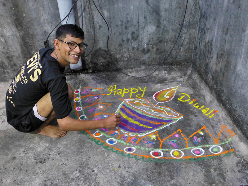 Pour la fête des lumières, les habitants illuminent leur maison avec des lampes à huile ou autres lumières, dessinent des rangolis et les plus jeunes jouent avec toutes sortes de pétards, marquant ainsi la victoire de la lumière sur l'obscurité, de la connaissance sur l'ignorance et du bien sur le mal.