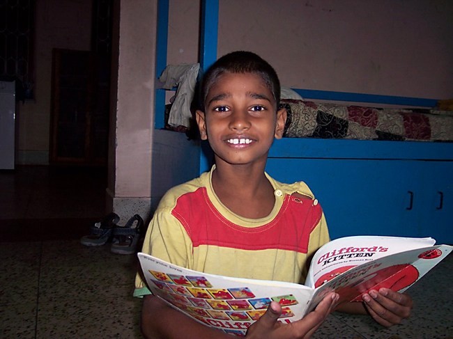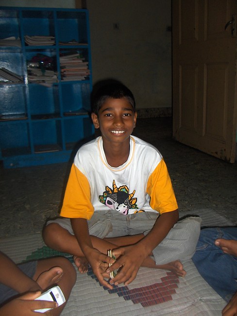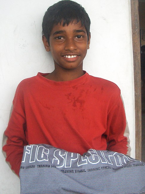 Arun reçoit un tee-shirt de sa marraine, octobre 2008