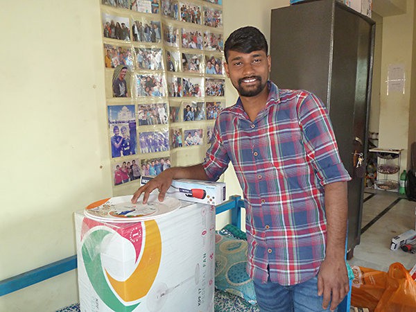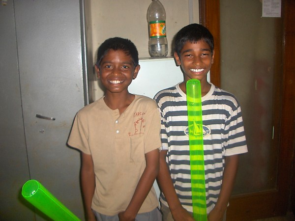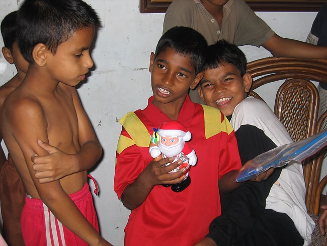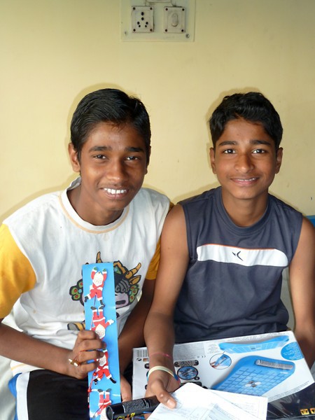Arun et Akash reçoivent un colis de la part de la marraine de Arun, décembre 2011