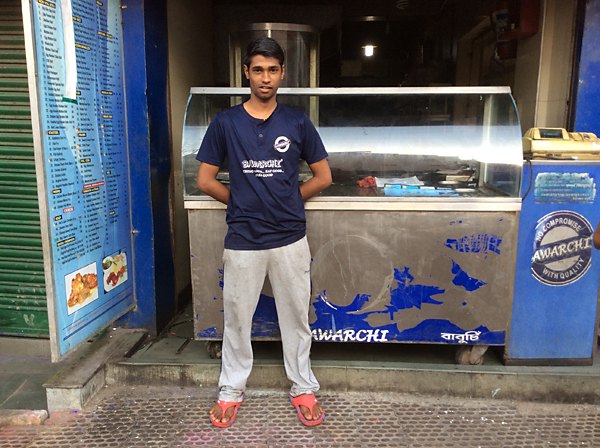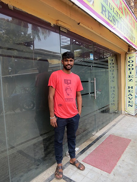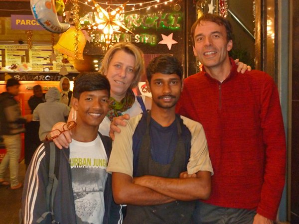 Arun avec Debashis, Laurence et Charles devant le restaurant où il travaille, décembre 2016
