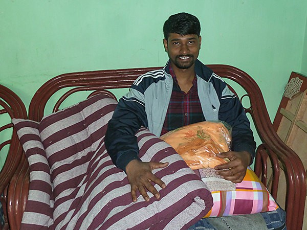 Arun reçoit un kit literie par l'association "Espper", janvier 2019