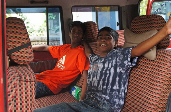 Arun et Biki dans la voiture, arrivent à Shankarpur pour deux jours avec les parrains, avril 2012