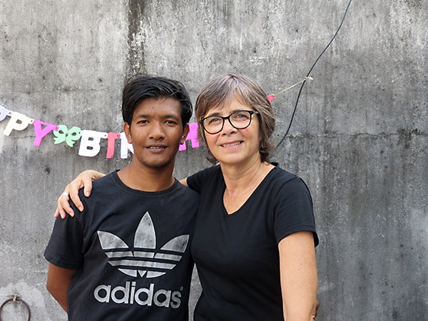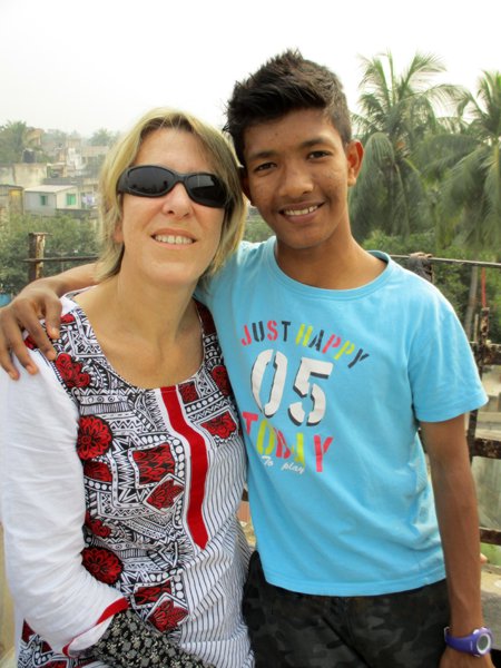Debashis avec Fabienne et les garçons du foyer après le spectacle, janvier 2019