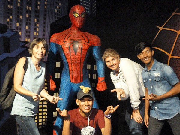 Debashis avec Fabienne, Rabi, Cathy et Spiderman musée de cire, avril 2018