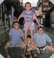 De g. à dr. : Nooralam, Sanjay portant Surajit, et Antony, les 4 premiers enfants vivant aujourd'hui dans le foyer de Fabienne