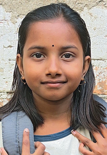 Minakshi, 11 ans, est une excellente élève de Classe VI. Ses parents se sont chacun remariés et ont abandonné leurs filles aux grand-parents, qui vivent dans la grande précarité. Elles sont bien traitées mais le grand-père ne peut plus beaucoup travailler et en 2023, il avait arrêté de payer les cours du soir. L'association finance les frais d'admission, les cours de soutien, le matériel scolaire et le médical si besoin.